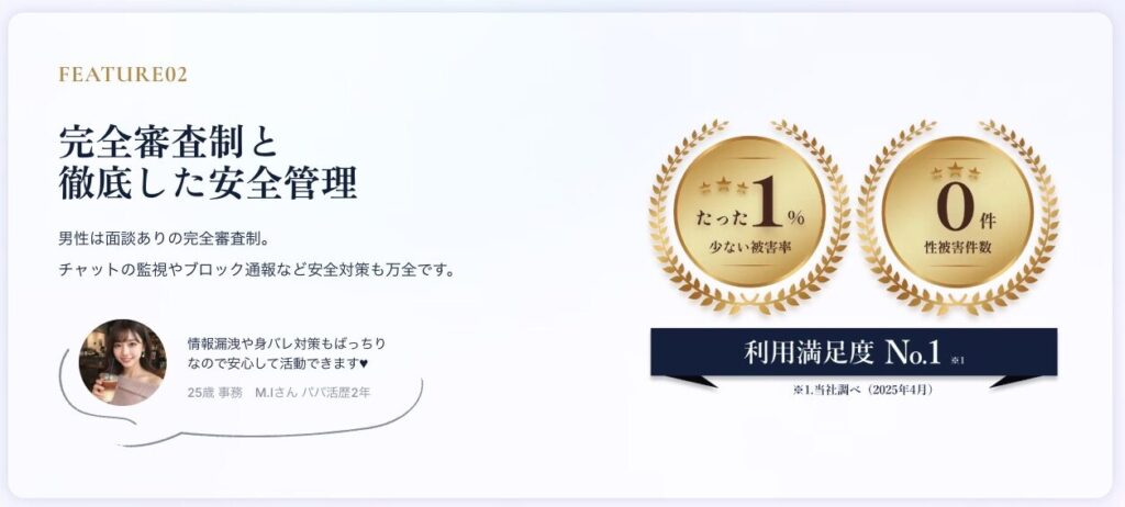 通常のパパ活アプリとは異なり、入会審査・本人確認の強化といった独自の強みがポイントです。さらに「会員の質」「安全性」「出会いの効率」においてトップクラスです。